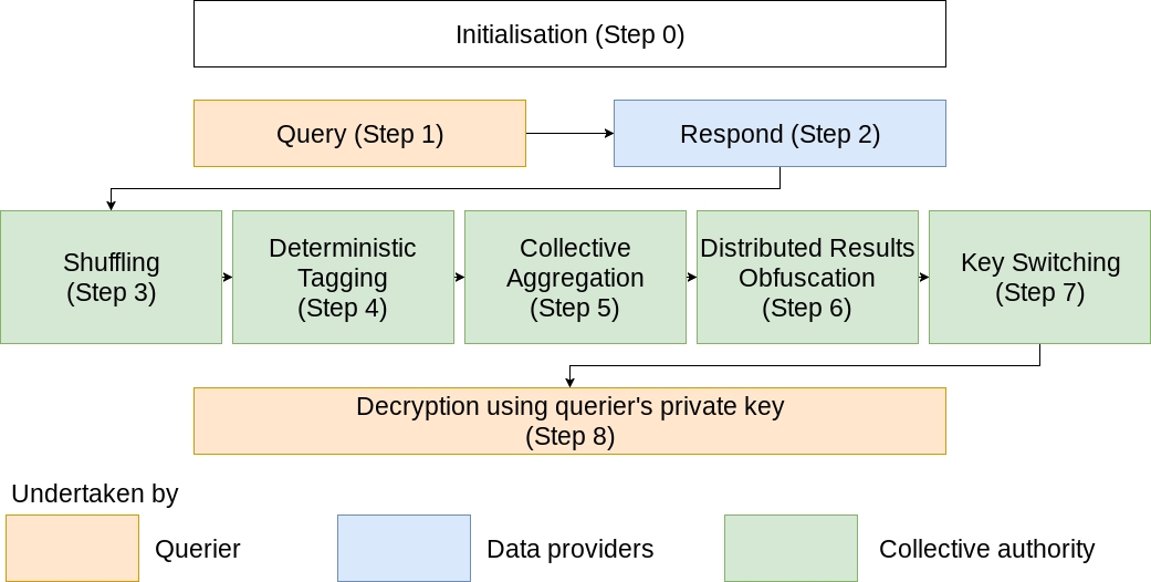 The UnLynx service was built with the intention of supporting the sharing of sensitive data in a secure and private way. Our solution starts with a query sent to UnLynx and then broadcast to a number of different data providers. Each of these will respond with homomorphically encrypted data. This information will be encrypted under a collective key (collectively built by the conodes) and then shuffled, thus, preventing any entity from linking back the responses to their respective owners. UnLynx will deterministically compute tags on some of the response fields and then use them to aggregate the remaining sensitive data. The final results are sent back to the querier.